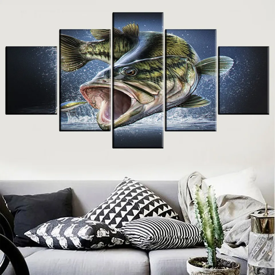 Canvas Print Painting Home Decor 5 Panel Largemouth Bass Fish Jumping Out Of Water Poster Wall Art Kitchen Restaurant Pictures Painting Calligraphy Aliexpress