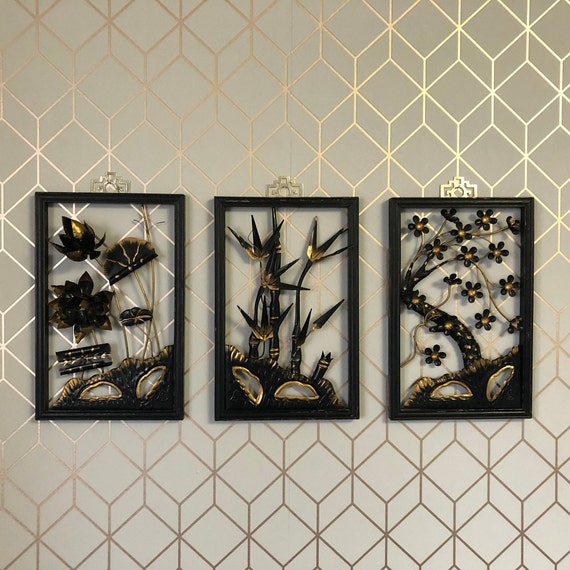 Vintage Metal Wall Decor Chinoiserie Gold And Black Set Of Etsy