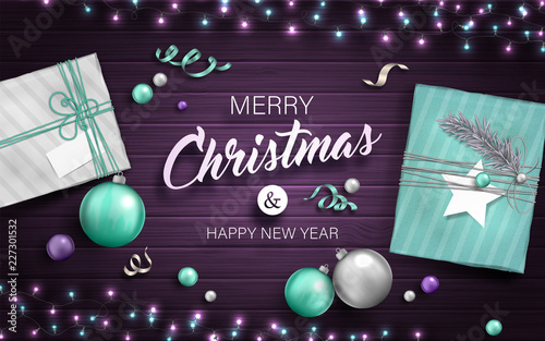 Beautiful Background With Christmas Decoration Vector Illustration Of Happy New Year 2019 With Blue And Silver Christmas Balls Gifts Garlands And Ribbons On Purple Backdrop Holiday Greeting Card Buy This Stock