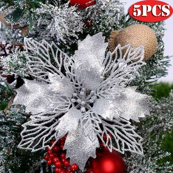 5pcs Set Artificial Christmas Flowers Glitter Fake Flowers Merry Christmas Tree Decorations Gift Xmas Ornament Xmas Decoration Wish