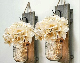 Amazon Com Gbtroo Rustic Mason Jar Sconces For Home Decor 6 Hours Timer Decorative Flower Wall Decor With Led Strip Lights Silk Hydrangea And Wrought Iron Hooks For House Decoration Set Of 2