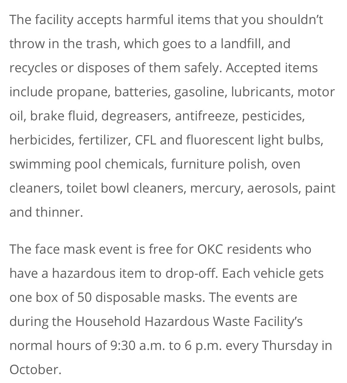 City Of Okc On Twitter Okc Residents Can Get A Free Box Of Disposable Face Masks Every Thursday In October In Exchange For Dropping Off Hazardous Waste Https T Co Vetfmplxlv Https T Co Nmbcs3wlca