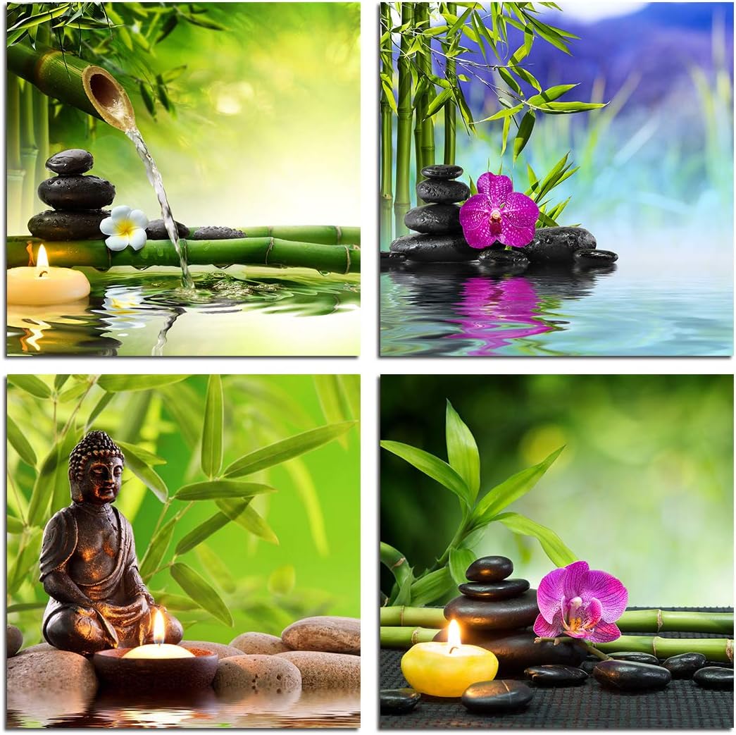 Amazon Com Zen Garden Wall Art Canvas Spa Green Bamboo Leaves Purple Orchid Stones Flowers Water Buddha Poster Aromatic Candle Still Life Home Decoration Yoga Modern Decor 4 Pieces Artwork Print Unframed