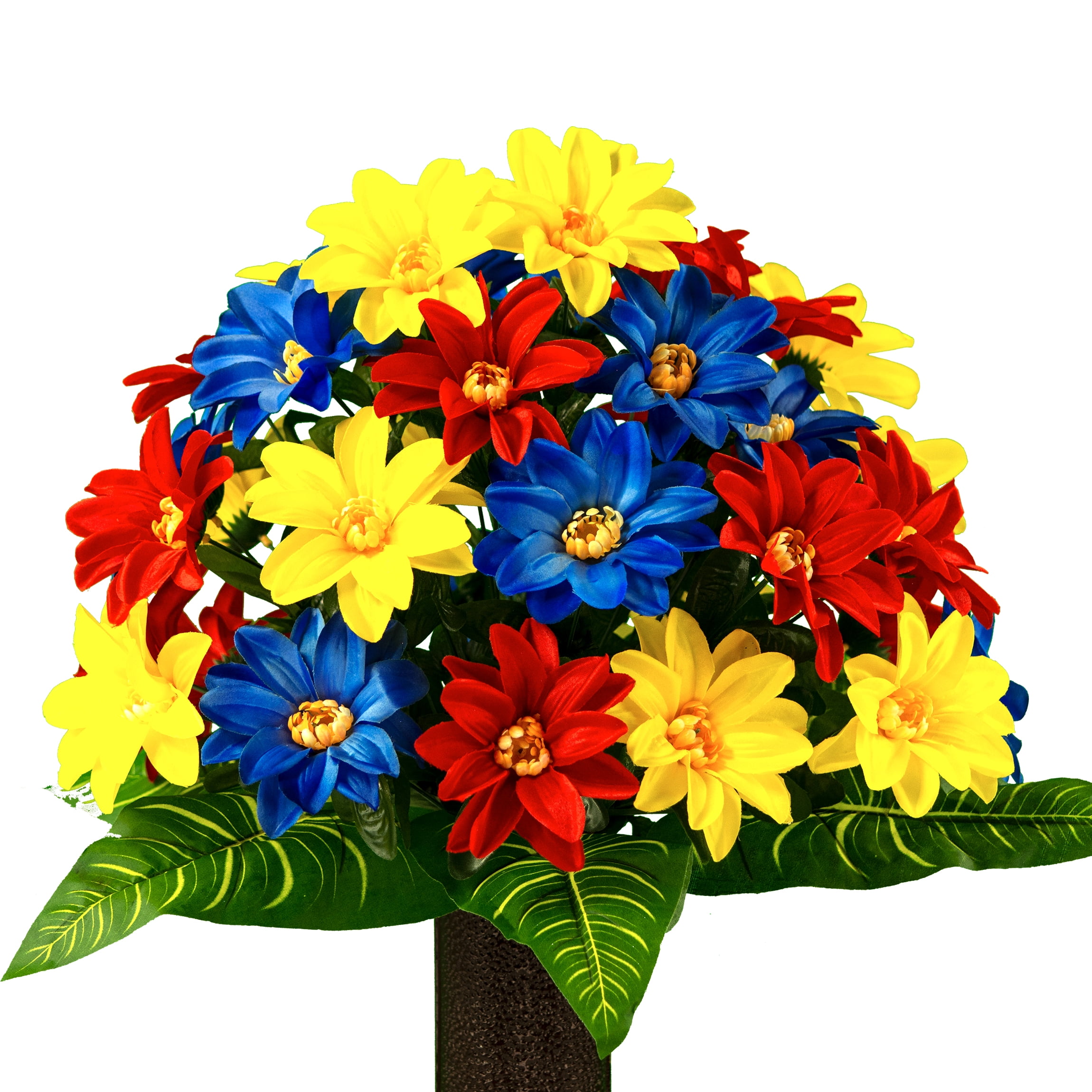 Sympathy Silks Artificial Cemetery Flowers Realistic Outdoor Grave Decorations Non Bleed Colors And Easy Fit Blue Red Yellow Dahlia Bouquet Walmart Com Walmart Com