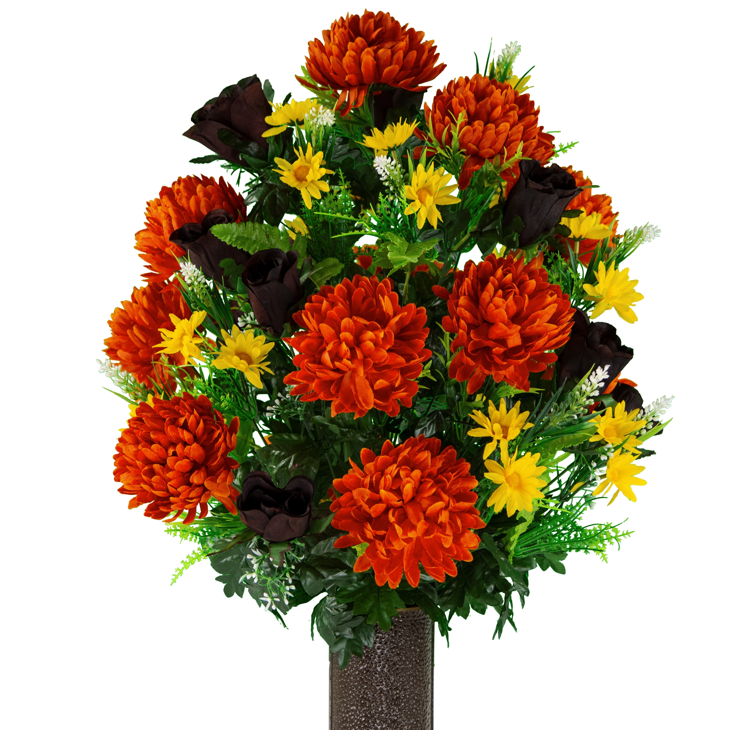 Sympathy Silks Artificial Cemetery Flowers Realistic Outdoor Grave Decorations Non Bleed Colors And Easy Fit Orange Mum Mahogany Rose Bouquet Walmart Com Walmart Com