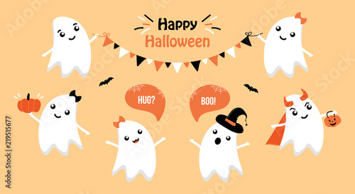 Set Collection Of Cute Cartoon Ghost Characters Having Fun Dressing In Different Costumes Hanging Decorations And Celebrating Halloween Buy This Stock Vector And Explore Similar Vectors At Adobe Stock Adobe Stock