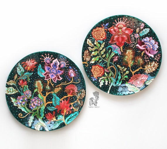 2 Hand Painted Wall Hanging Decorative Plates With Colorful Flowers 10 1 2 Ebay