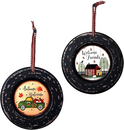 Amazon Com Cvhomedeco Primitives Rustic Homespun Hanging Decorative Plates Christmas Tree Wall Hanging Decor Art 5 3 4 Inch Set Of 2 Truck Farmhouse Home Kitchen