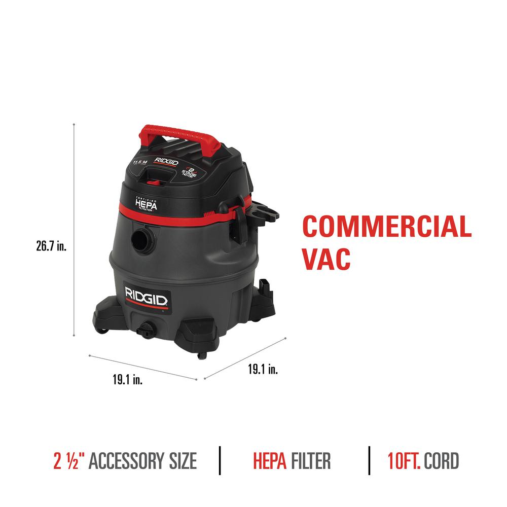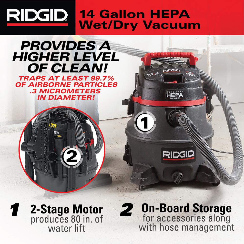 Ridgid 14 Gal 2 Stage Hepa Commercial Wet Dry Shop Vacuum With Filter Dust Bag Professional Hose And Accessories Rv2400hf The Home Depot