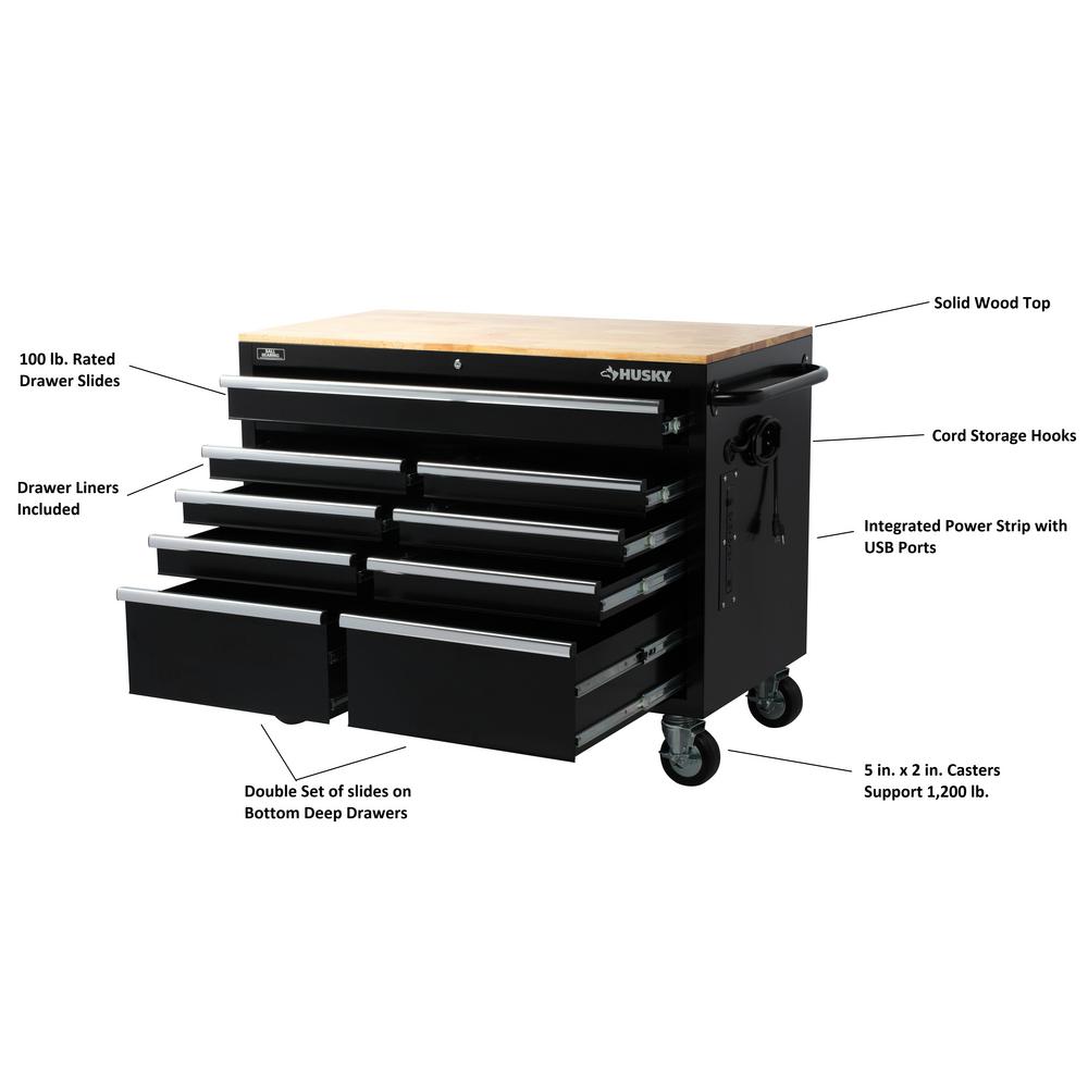 Husky 46 In W 9 Drawer Deep Tool Chest Mobile Workbench In Gloss Black With Hardwood Top H46mwc9xd Tl The Home Depot
