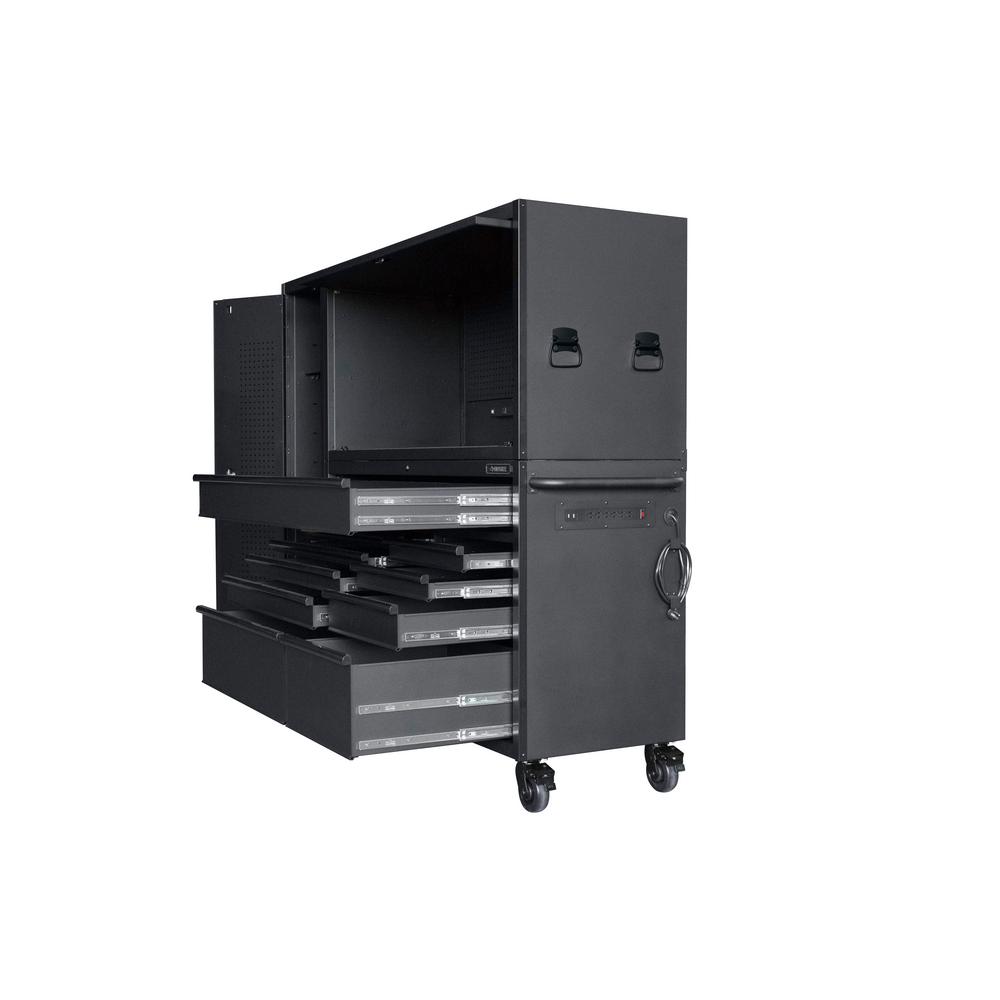 Husky 62 In W 14 Drawer Deep Tool Chest Mobile Workbench In Gloss Black With Solid Wood Top Hotc6214b11mys The Home Depot Mobile Workbench Tool Chest Workbench