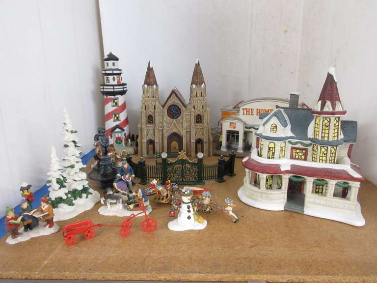 Albrecht Auctions Christmas Village Items Santa S Workbench Collection 1999 Includes Lighthouse Fence With Gate Fountain Fountain And Park Bench Victorian House Home Depot Cathedral Pine Tree Santa With Reindeer Bicycle Tricycle