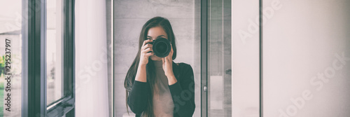 Selfie Self Portrait In Home Mirror Young Woman Taking Self Photo With Slr Camera Panorama Banner Background House Lifestyle Buy This Stock Photo And Explore Similar Images At Adobe Stock Adobe
