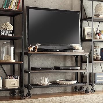 Amazon Com Modhaus Living Modern Industrial Rustic Riveted Black Metal Wood Tv Stand With Decorative Wheels Includes Tm Pen 48 Furniture Decor