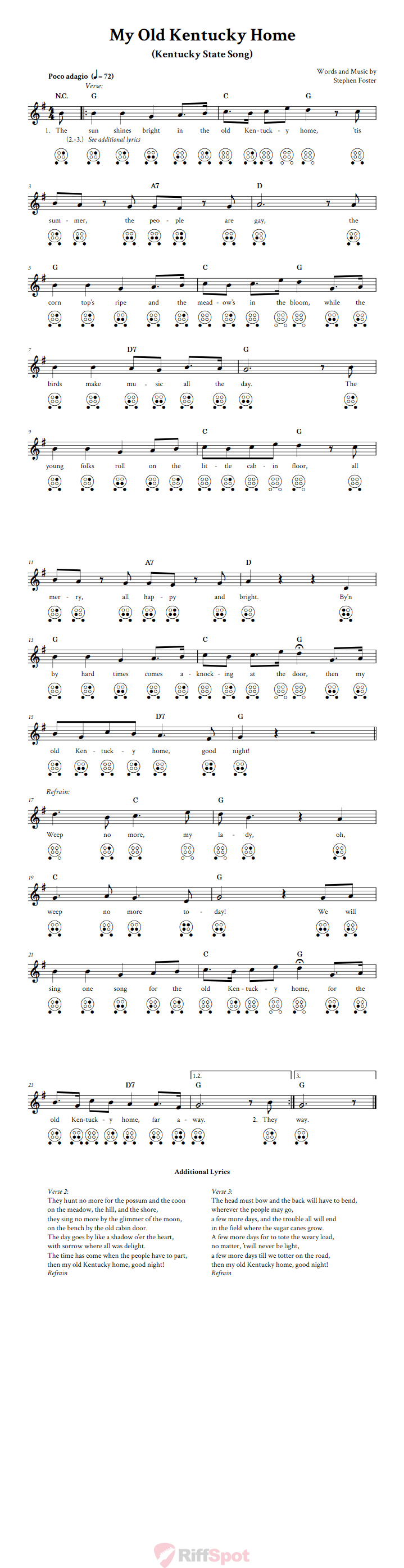 My Old Kentucky Home Sheet Music Stephen Foster Guitar Chords Lyrics