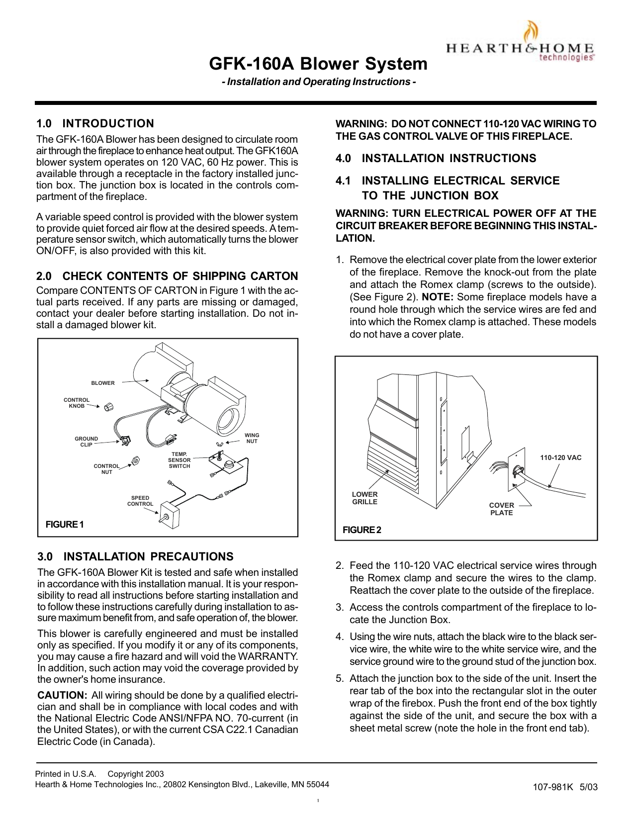 Hearth And Home Technologies Blower Gfk 160a User Manual Manualzz