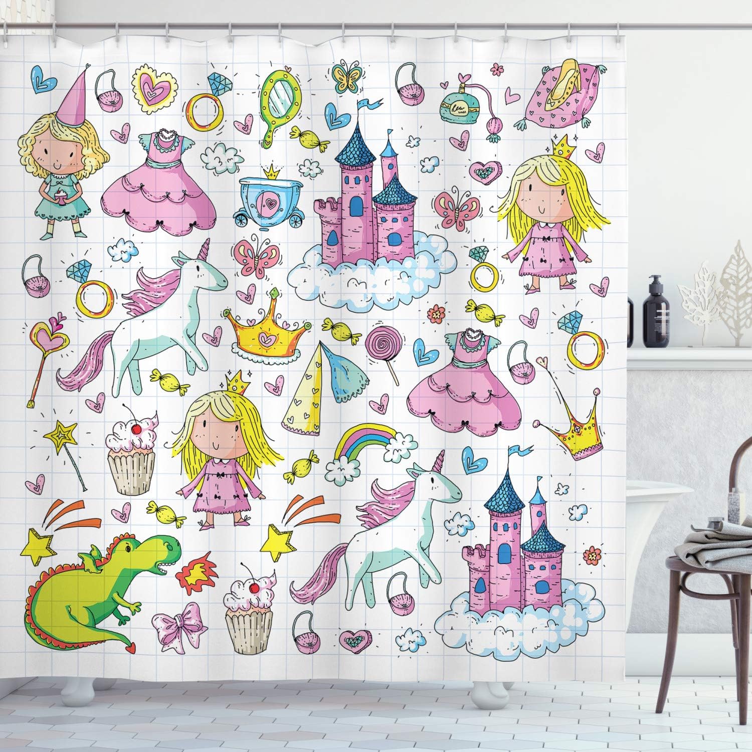 Amazon Com Ambesonne Princess Shower Curtain Bundle Of Girls Kids Composition Fairytale Fantasy Characters Castles Accessories Cloth Fabric Bathroom Decor Set With Hooks 84 Long Extra Multicolor Home Kitchen