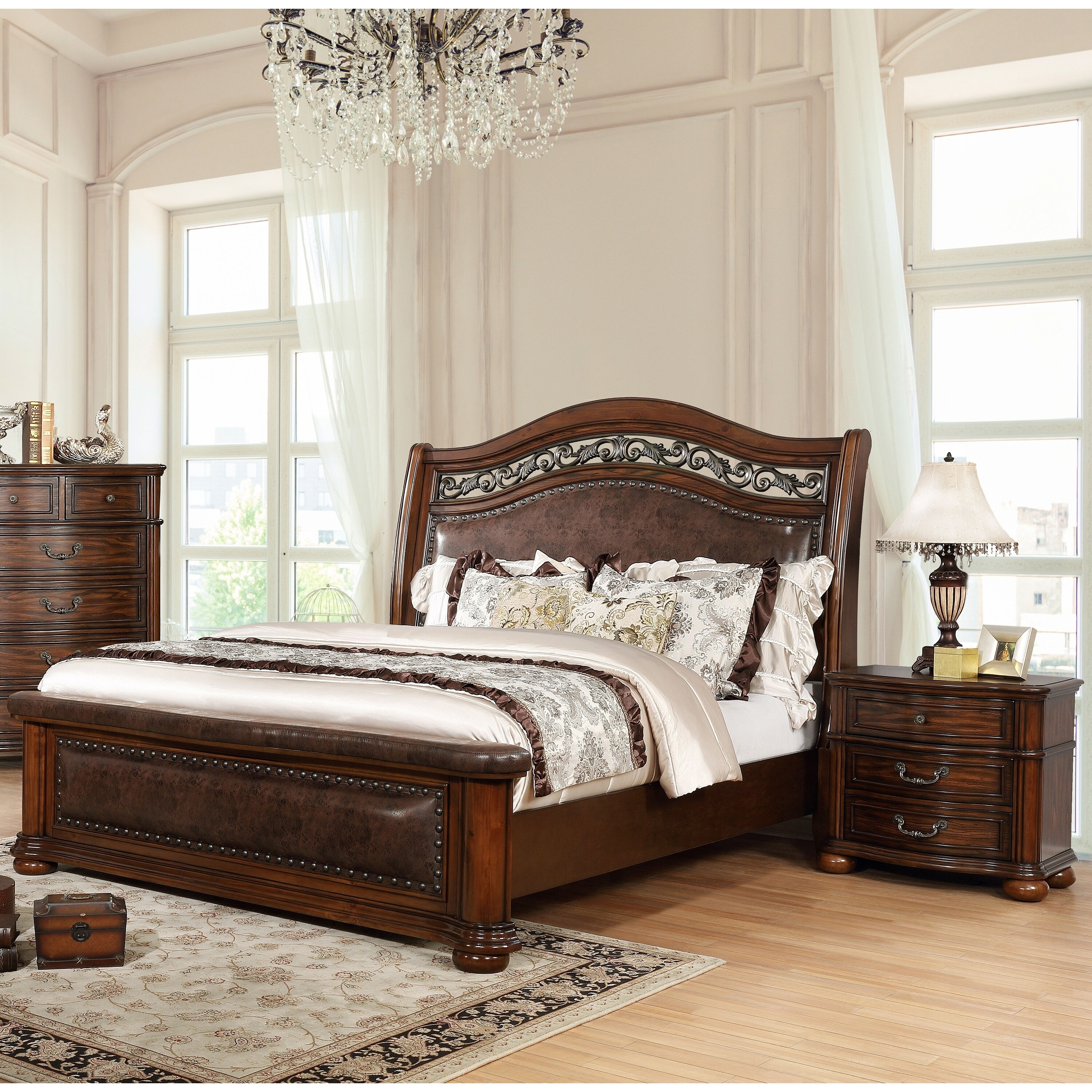 F9231 5 Pc Queen Anne Cherry Finish Wood Sleigh Style Queen Bed Set