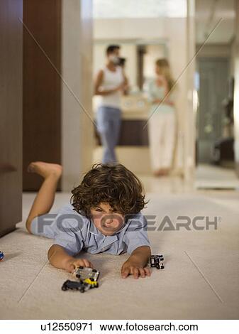 Boy Playing With Car Toys Parents In The Background Stock Image U12550971 Fotosearch
