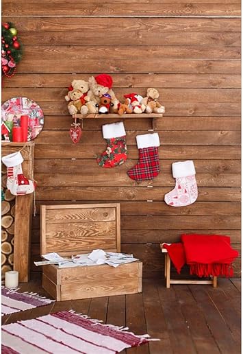 Amazon Com Laeacco Christmas Backdrop Vinyl 5x7ft Indoor Wooden Box Xmas Stockings Bear Toys Wooden Wall Floor Background Child Kids Adult Shoot Xmas Celebration Party Banner Greeting Card Studio Props Camera