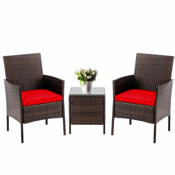 3 Piece Wicker Outdoor Garden Bistro Set 2 Chairs End Table Red Cushions Patio For Sale Online