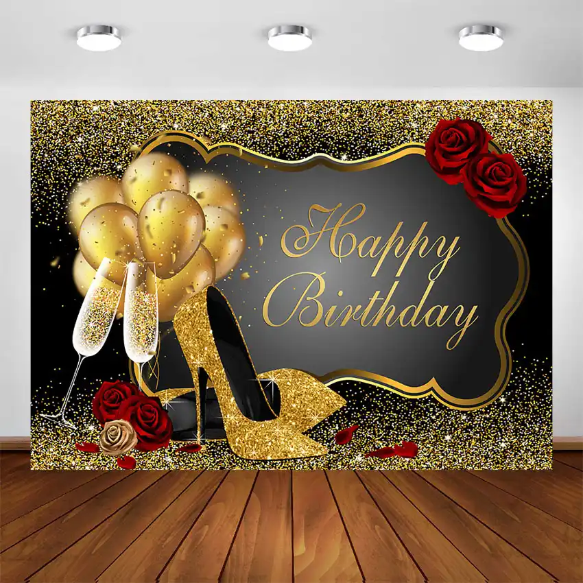 Amazon Com Happy Birthday Backdrop Glitter Gold Red Rose Floral Golden Balloons Heels Champagne Glass Background For Adults Women Birthday Party Decorations Birthday Party Decorations 5x3ft Vinyl Toys Games