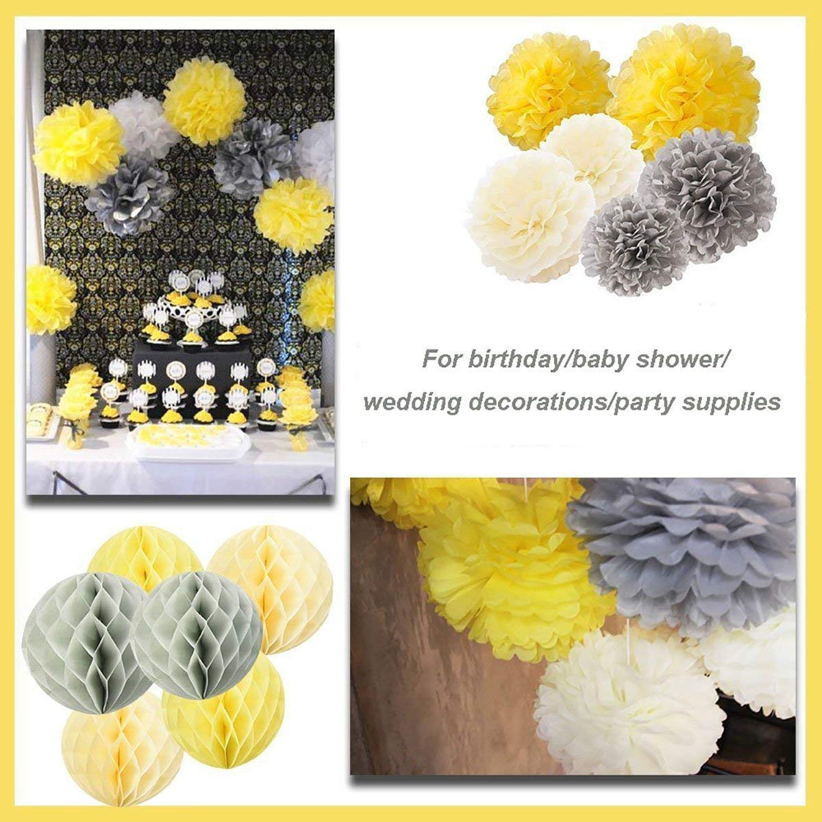 Furuix 15pcs Yellow Grey Elephant Baby Shower Decorations Tissue Paper Pom Pom Tissue Paper Honeycomb Balls